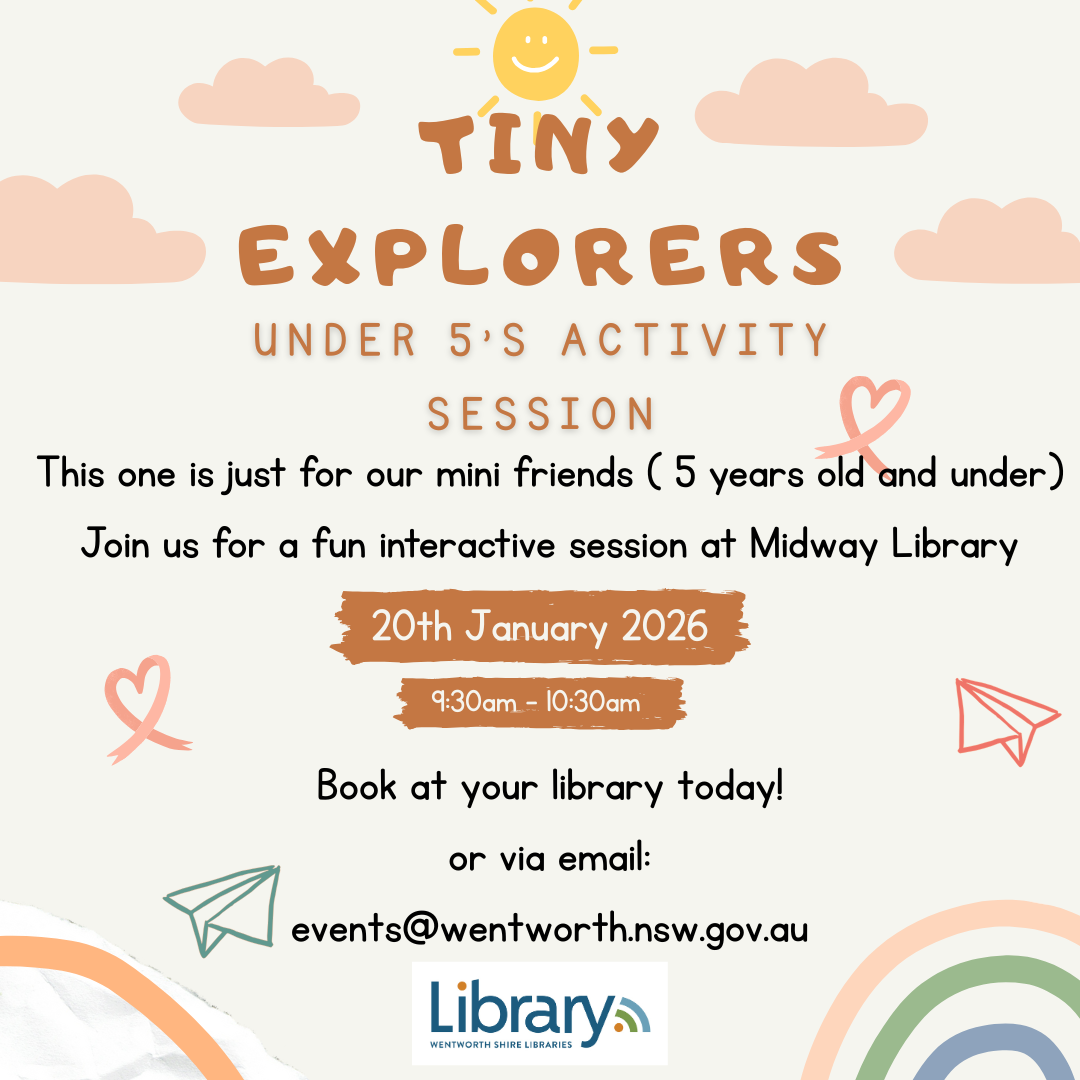 📞 To Book: Contact your local library directly or email: 📧 events@wentworth.nsw.gov.au