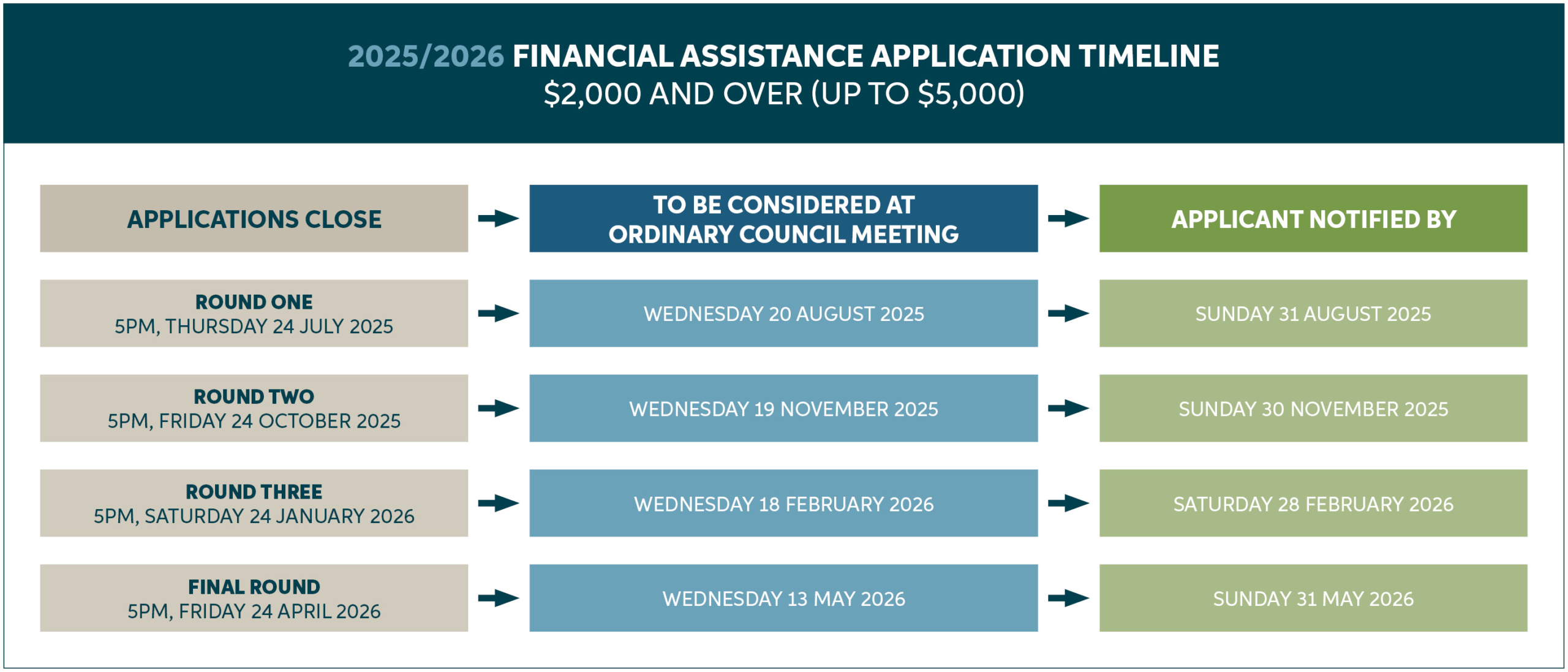 - Financial Assistance Program Grants – Any other Grant requests under the Financial Assistance Program will be referred to Council for a resolution. It is important to note that the decisions about whether to grant an application request rests totally with Council and cannot be delegated to Council staff. Council only considers applications under this program four times per financial year. Therefore, to avoid disappointment, applicants are urged to provide a complete application and submit within the timelines provided.